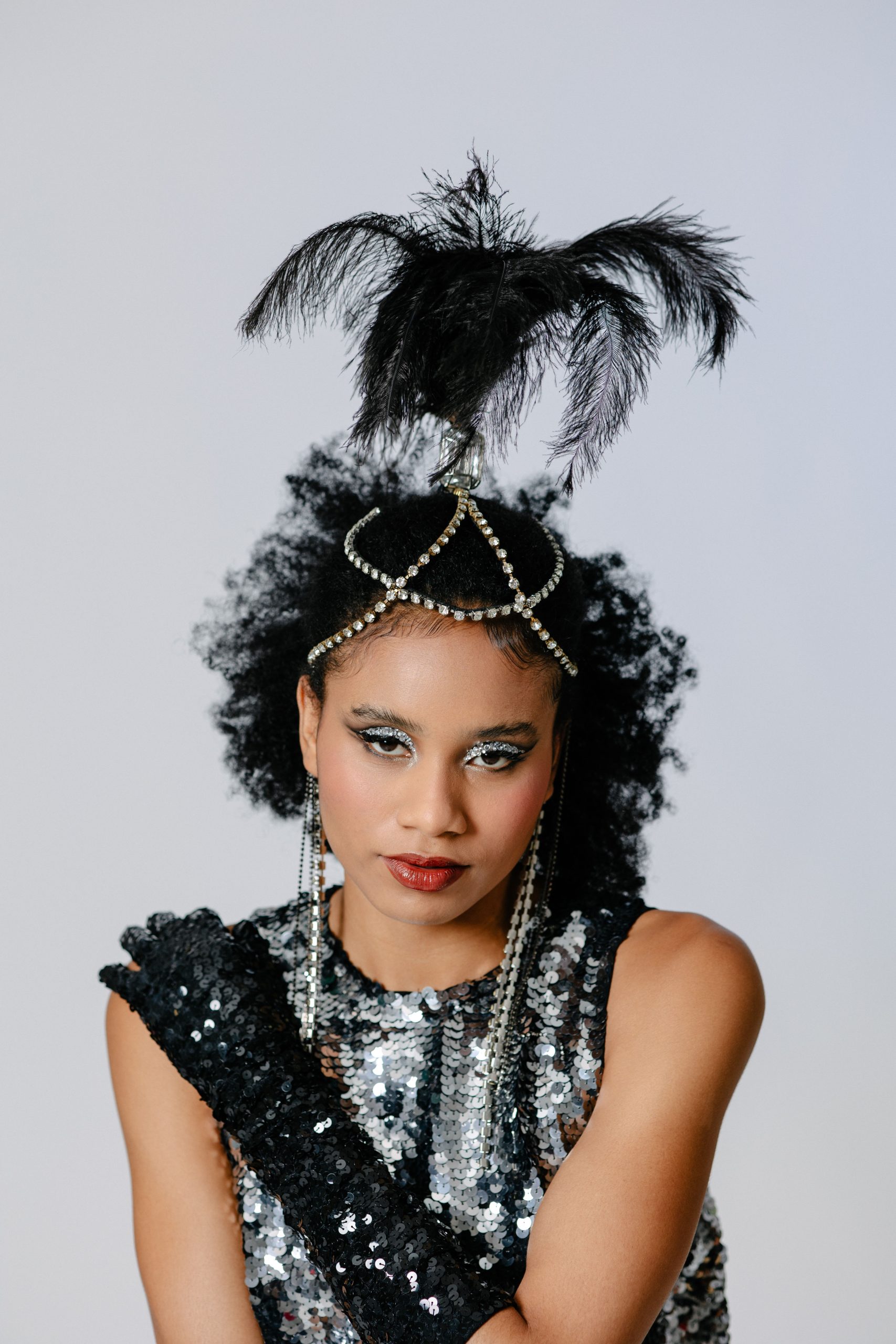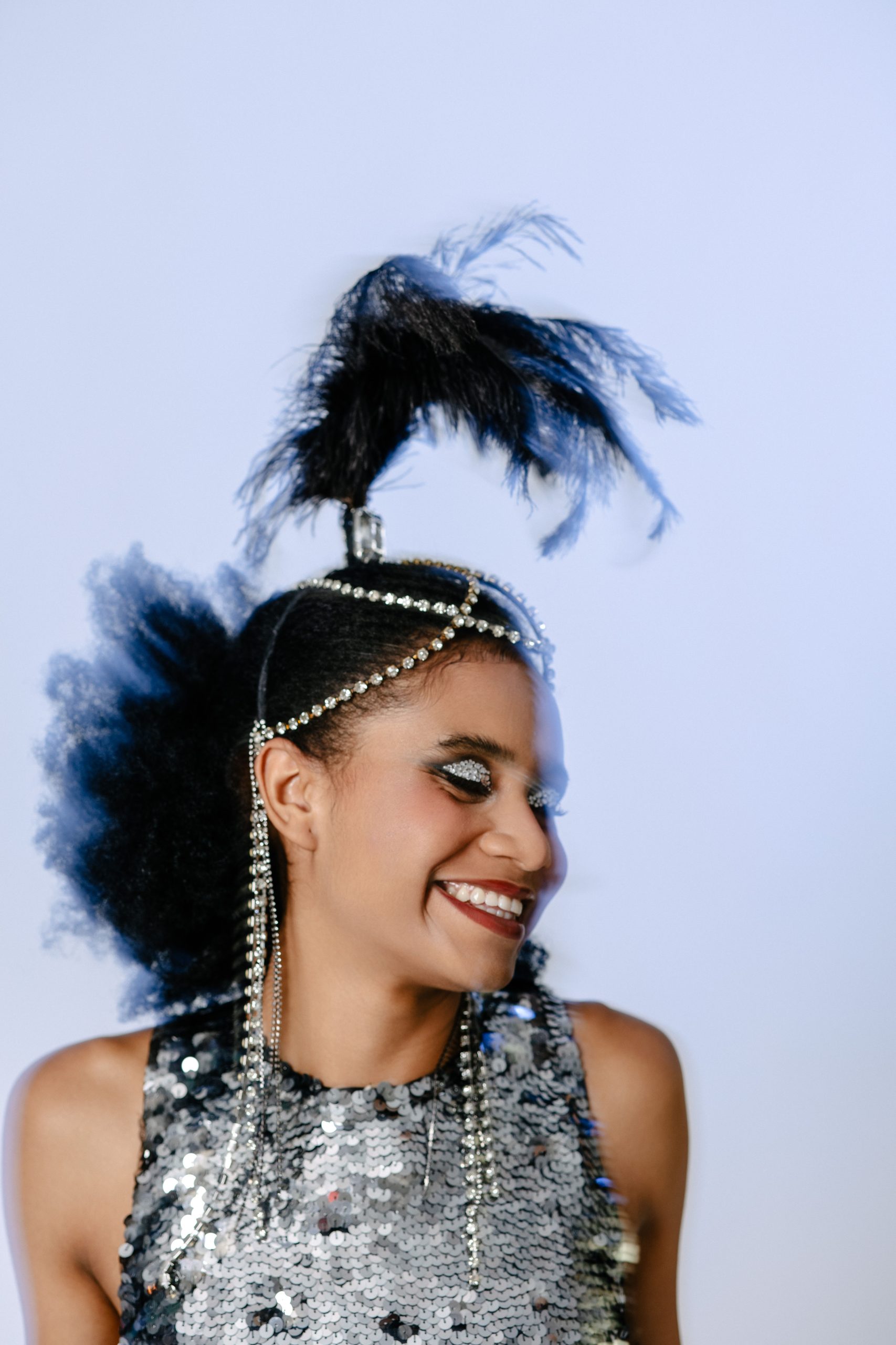 Fascinator com base de arame, adornado com plumas, pedras e correntes de strass. Uma peça leve, marcante e cheia de atitude, perfeita para brilhar na folia do Carnaval.