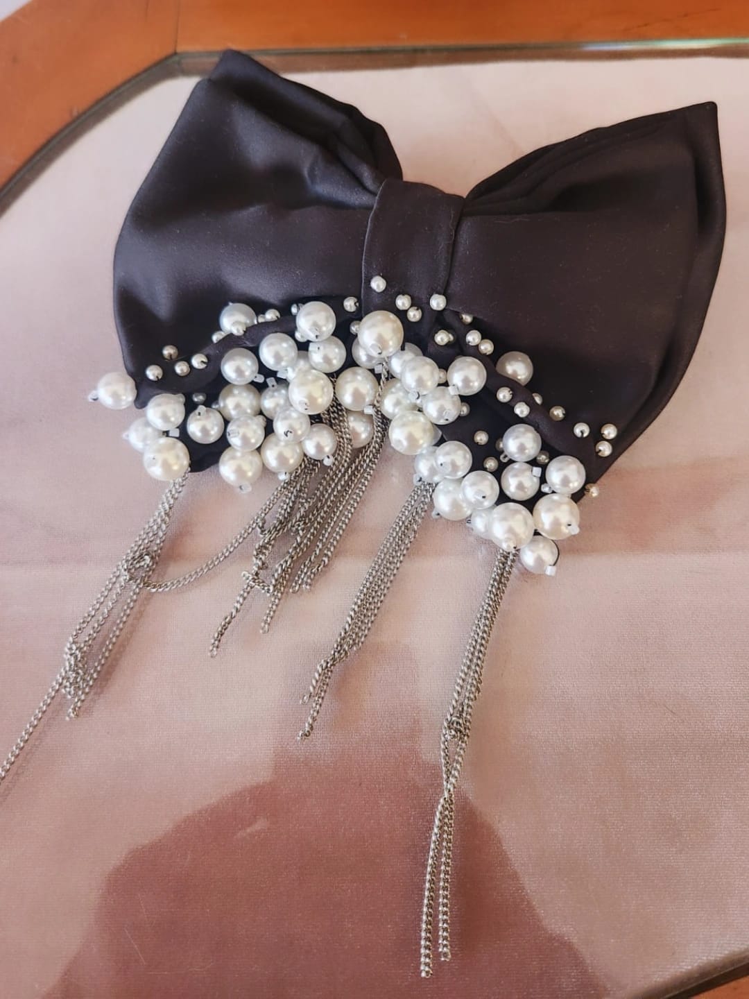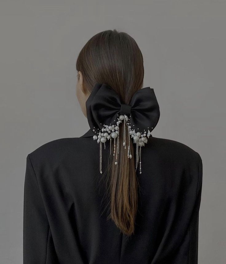 Laço Eclipse é um acessório em cetim preto que combina elegância clássica com um toque moderno. As pérolas iluminam a peça com delicadeza, enquanto as correntes acrescentam movimento e atitude na medida certa.